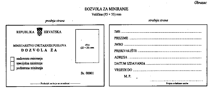 Ovime se Pravilnikom propisuje obrazac dozvole za miniranje (u daljnjem štivu: dozvola), način izdava-nja i zamjene te vođenje upisnika o izdanim doz-volama.